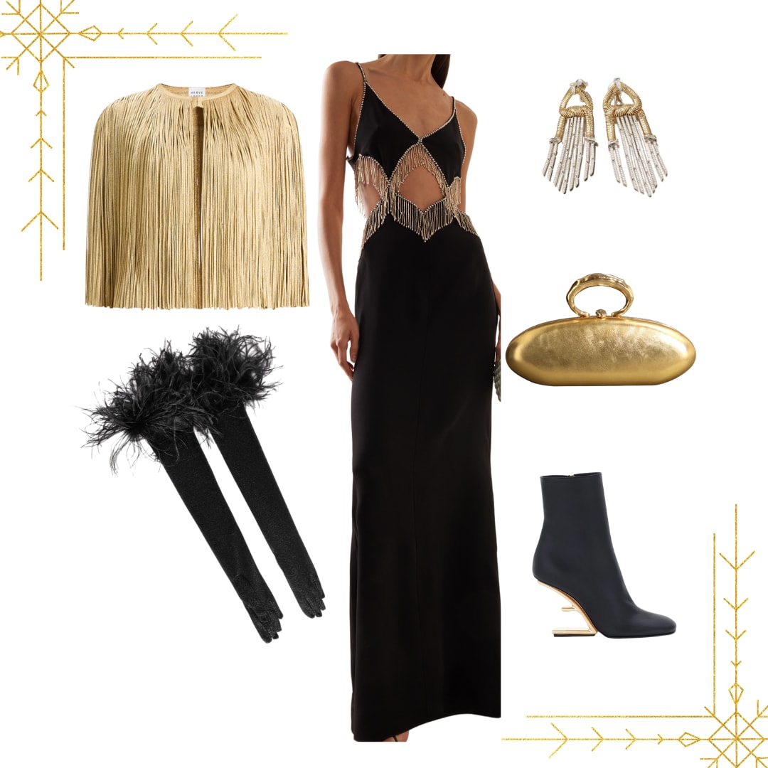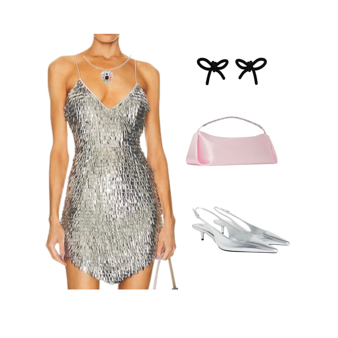 With this voluminous black satin attached skirt, and round neck fitted tonal top, this dress is sure to flatter most shapes. The added beige cardigan adds a touch of class and will keep you warm as well. The bow-tie drop earrings ads that touch of flare that will woo your friends and the gold chain necklace tie the whole look together.